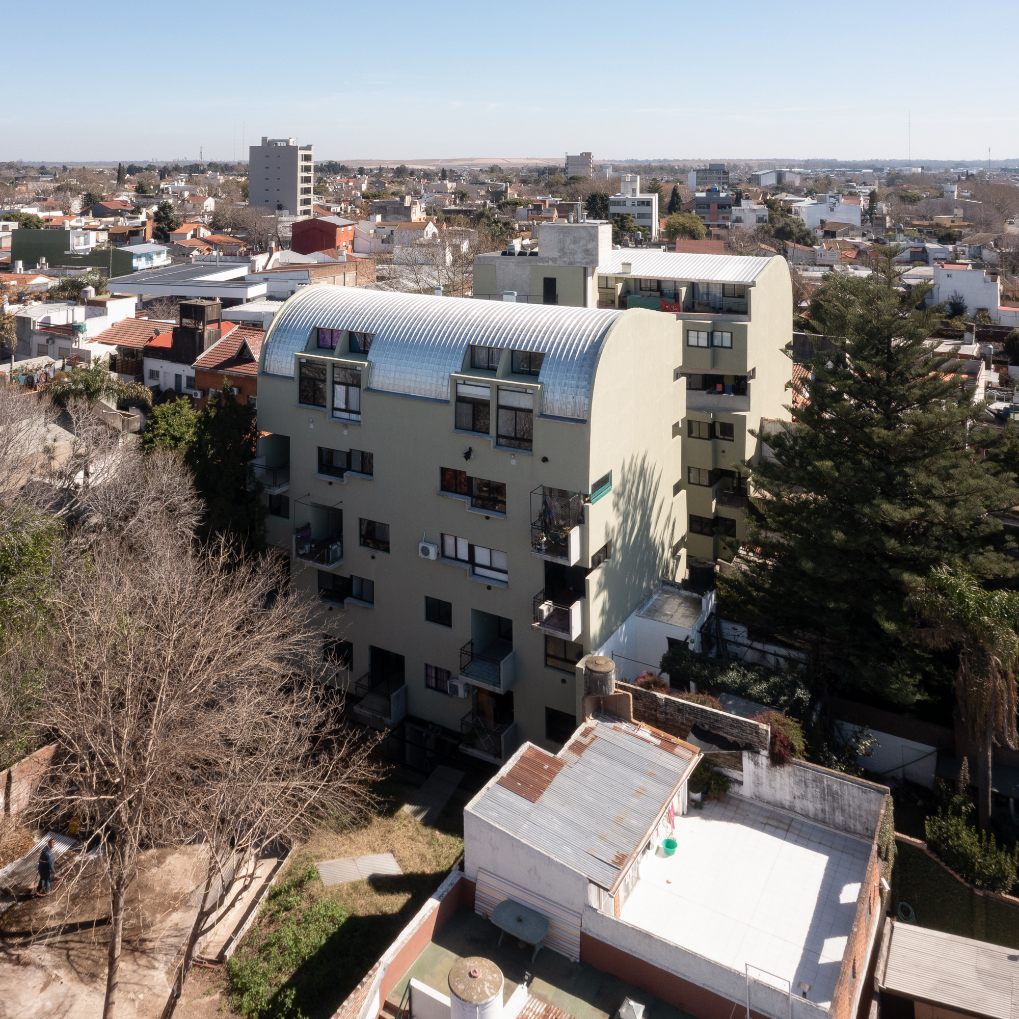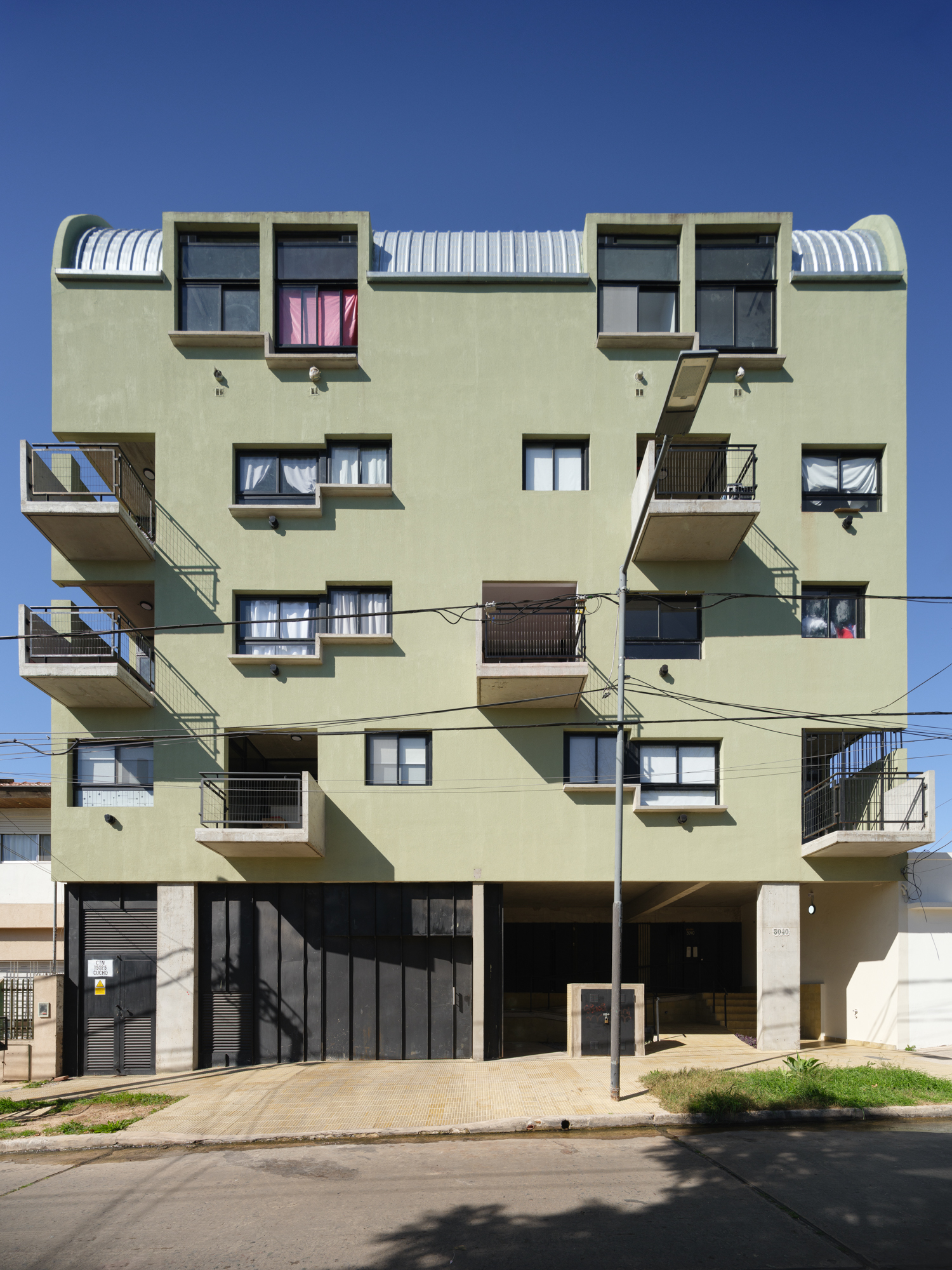 Biarritz is a collective housing building for a cooperative of education workers in Buenos Aires province. It was designed and constructed in a collaborative effort that took into account in equal measure the cooperative’s needs, the building’s site, and the building codes and zoning regulations in effect in the county of San Martín—three factors that rarely converged. Three different types of homes were designed—one-, two-, and three-bedroom units, with variations so that no two units were alike: two-bedroom duplex apartments on the highest two floors, or on a single level but with the two bedrooms adjacent or separated, depending on the preferences of the inhabitants; balconies where the exterior space juts into the homes to allow for a future expansion.