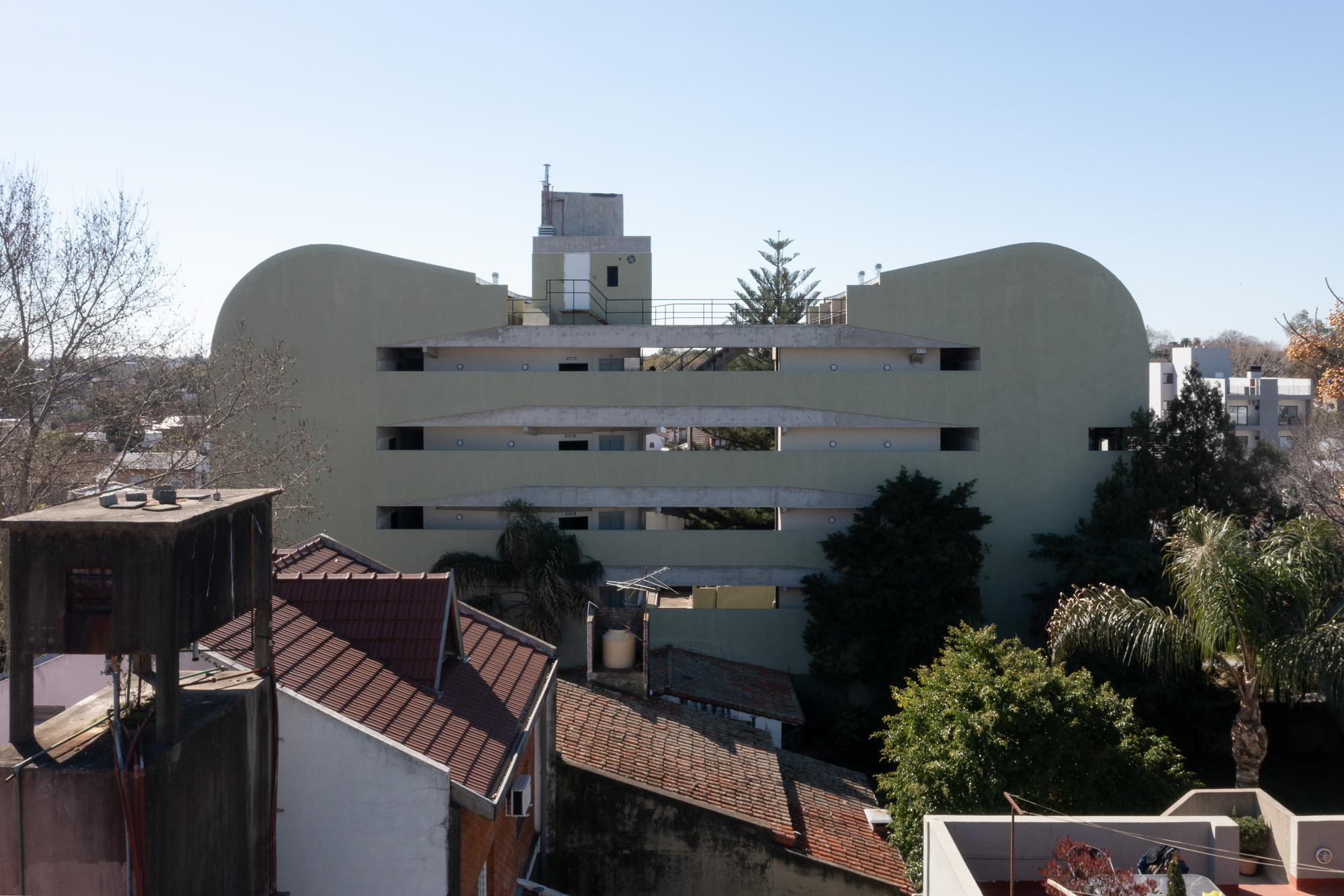 The building faces the north with a tiered courtyard onto which the one- and three-bedroom units look out. In the distance are train tracks that connect downtown Buenos Aires to its outskirts—a defining trait of the immediate landscape.